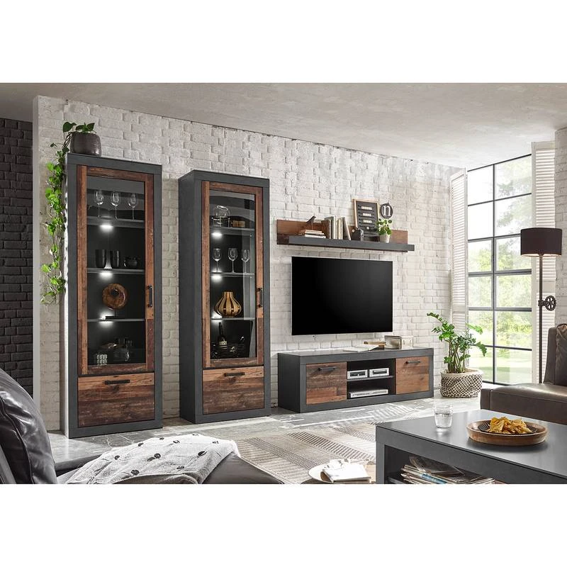 - Contenu de la livraison : Ensemble comprenant 2 vitrine, 1 tablette murale, 1 meuble TV et 1 buffet haut, sans éclairage ni accessoires
